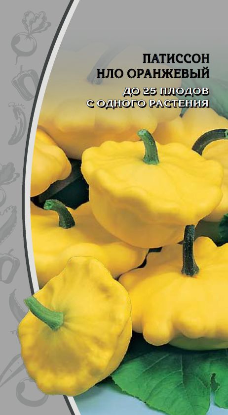 ПАТИССОН НЛО оранжевый- Раннеспелый сорт. Период от полных всходов до первого сбора плодов 40-45 дней. Растение кустовое, даёт 20-25 плодов. Плод дисковидный с зубчатыми краями. Поверхность гладкая, жёлто- оранжевая. Мякоть белая, плотная, вкус хороший и отличный. В плодах содержится до 6,3% сухих веществ, 2 - 3,4% сахаров. Масса плода 400-500 г. Холодостойкий. Относительно устойчив к мучнистой росе, бактериозу и оливковой пятнистости. Урожайность: 2,9-5,5 кг/м.кв. Используют молодые плоды, когда мякоть нежная и семена не развиты.
