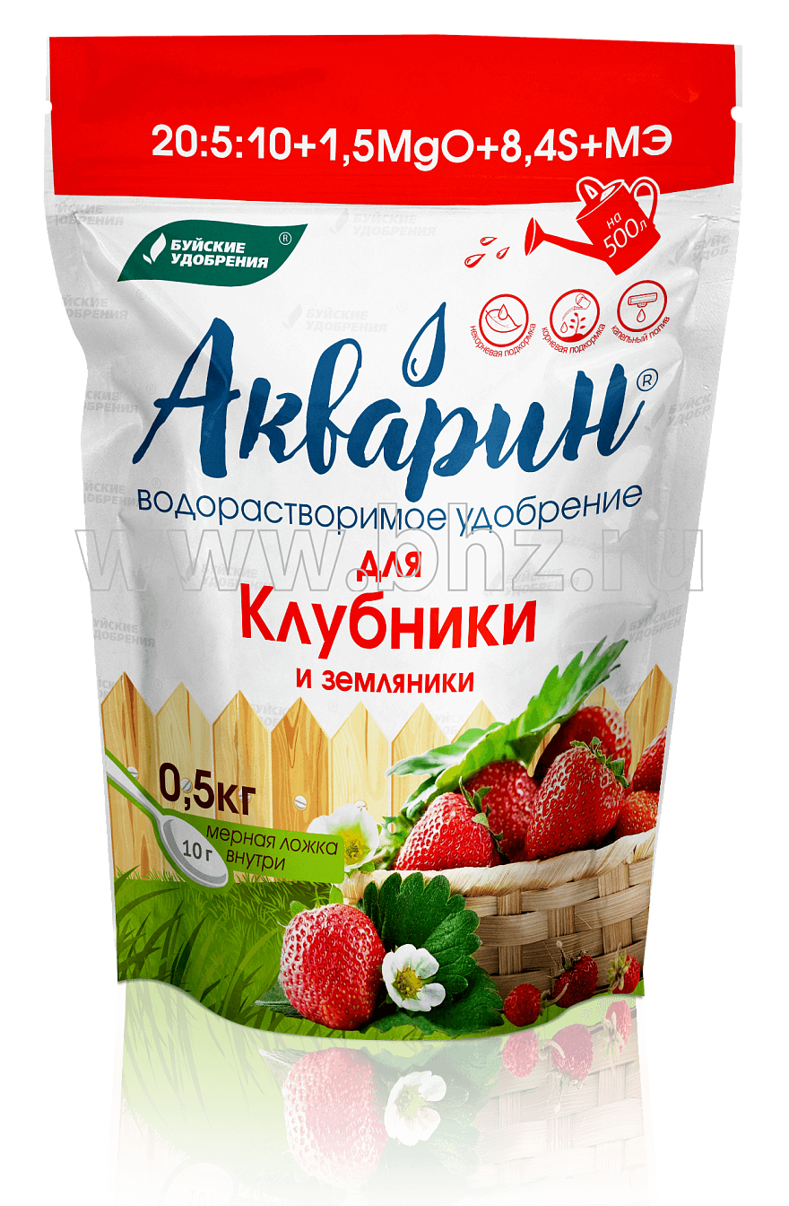 Акварин для клубники и земляники - водорастворимое удобрение, в состав которого входит азот, фосфор, калий, магний, сера и микроэлементы - железо, цинк, марганец, медь в хелатнойформе, а бор и молибден - в минеральной. Благодаря кислой реакции (pH) удобрения, оно легко растворяется в холодной воде и более эффективно усваивается корневой системой или листовой поверхностью растений.