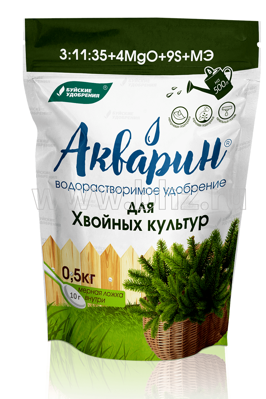 Акварин для хвойных культур - водорастворимое удобрение, в состав которого входит азот, фосфор, калий, магний, сера и микроэлементы - железо, цинк, марганец, медь в хелатнойформе, а бор и молибден - в минеральной. Благодаря кислой реакции (pH) удобрения, оно легко растворяется в холодной воде и более эффективно усваивается корневой системой или листовой поверхностью растений.