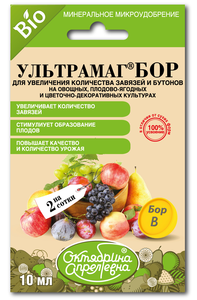 Ультрамаг Бор (минеральное микроудобрение) для увеличения количества завязей и бутонов на овощных, плодово-ягодных и цветочно-декоративных культурах.